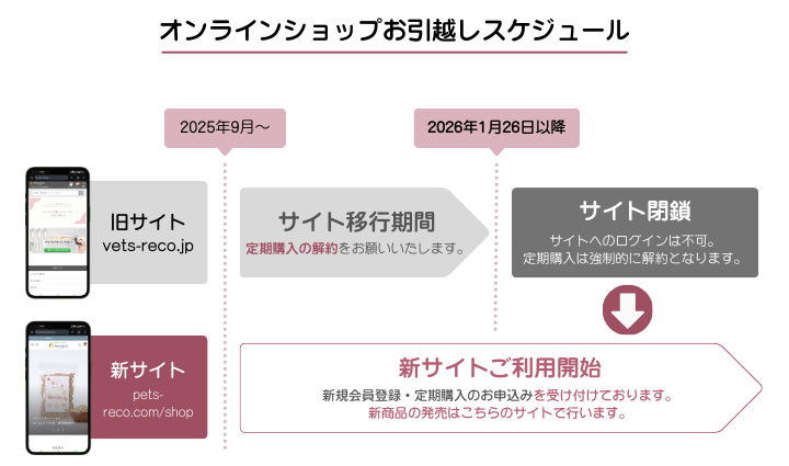 - 新サイト(pets-reco.com/shop)にて新規会員登録を行い、改めて定期購入のお申込みをお願いします。